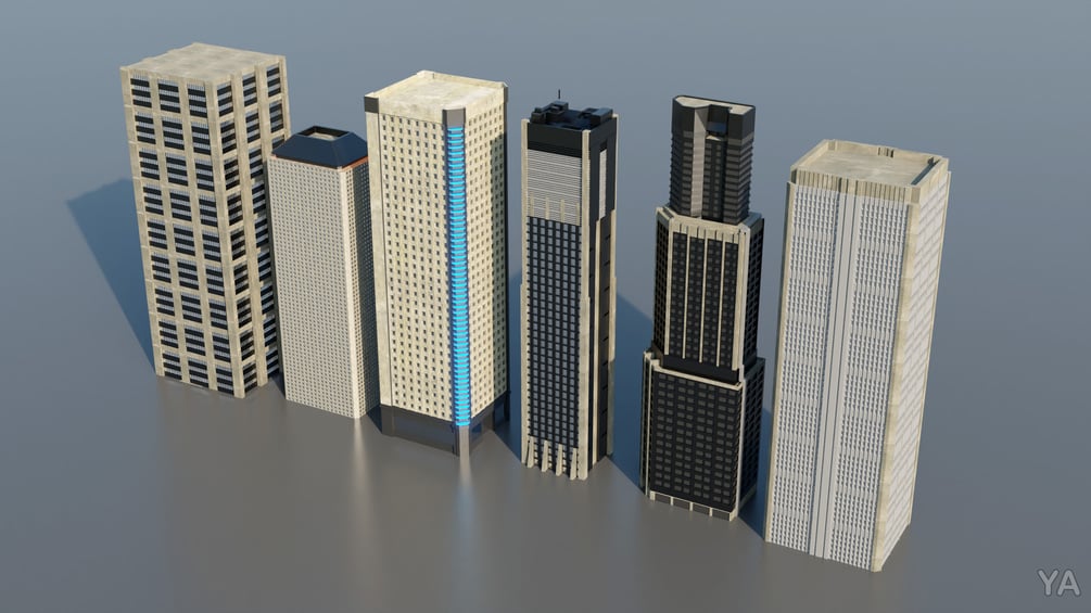 Six buildings for you to use in your scenes. They are not very high poly, but great for backgrounds.