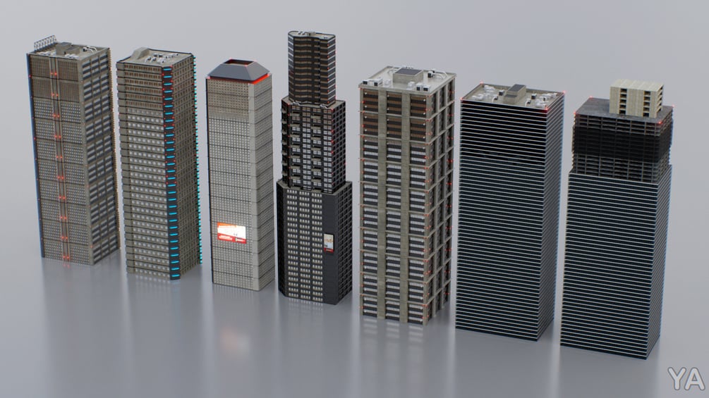Seven buildings for you to use in your scenes. They're mid-poly, not too many details but just enough to be used in backgrounds, renders, and animations.