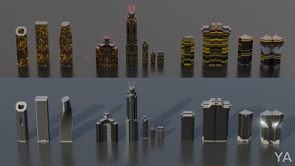 Twelve buildings for you to use in your scenes. They are efficient and filling your city scenes.
